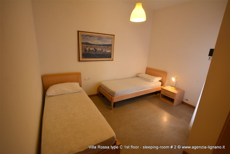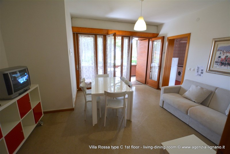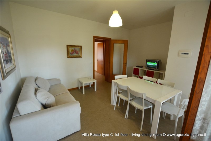 Příjemná vila se 6 apartmány se nachází v exkluzivní části Lignana Riviery. Má velmi dobrou polohu, jelikož leží velice blízko pláže, lázeňského komplexu, centra Lignana Riviery a Pinety, kde najdeme obchody, supermarkety, bary a pizzerie. Nedaleko leží i Riviera Park o rozloze 20.000 m² zeleně. Každá bytová jednotka má v dotaci WI-FI ZDARMA, TV se satelitem, MYČKA NÁDOBÍ, MIKROVLNNÁ TROUBA, trezor - použití zdarma, 1 číslované parkovací místo ve velké osvětlené zahradě.Typ C zvýšené přízemí- obývací pokoj - jídelna, KLIMATIZACE, rozkládací gauč, velká terasa se zahradním nábytkem - stolek, židle, 2 lehátka k opalování, kuchyňka s lednicí a mrazákem, 1 ložnice s manželskou postelí, 1 ložnice se 2 lůžky, koupelna se sprchovým koutem a pračkou, terasy, společná zahrada.