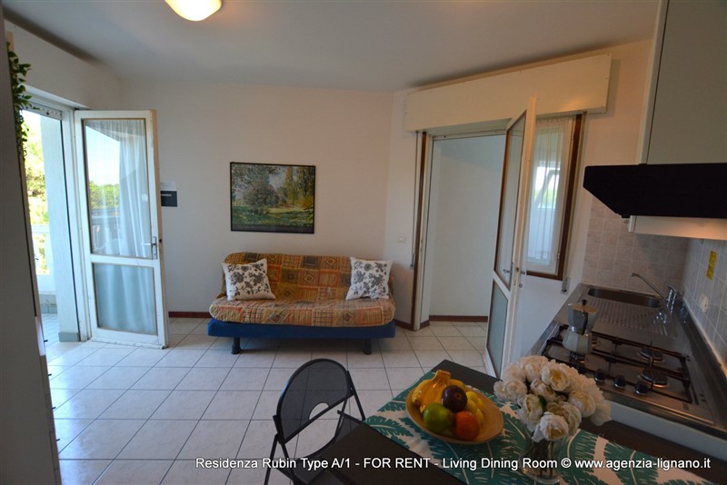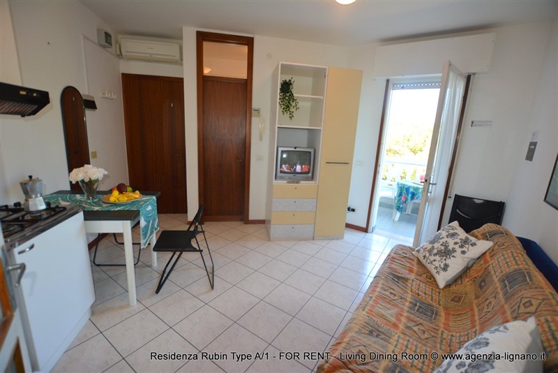 Příjemný apartmánový komplex nedaleko pláže a blízko centra Lignana Riviery, kde najdeme obchody, supermarkety, bary, restaurace, pizzerie. Každá bytová jednotka má v dotaci TV, trezor - použití zdarma, 1 očíslované parkovací místo nebo garáž. V objektu jsou k dispozici výtahy, bazén - lehátka volně k dispozici. Bazén je v provozu OD 1. KVĚTNA DO POLOVINY ZÁŘÍ, WI-FI zdarma u bazenu. V blízkosti leží Riviera Adventure Park o rozloze 20.000 m² zeleně.Typ A-1 - garsonka s KLIMATIZACÍ: obývací pokoj - jídelna, kuchyňský kout, rozkládací dvoulůžkový gauč + 1 jednolůžko, malá terasa, koupelna s oknem a se sprchovým koutem. Videoclip