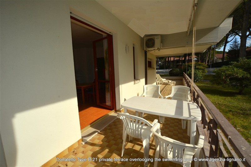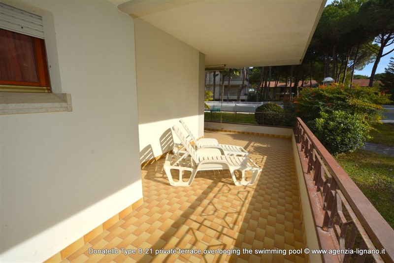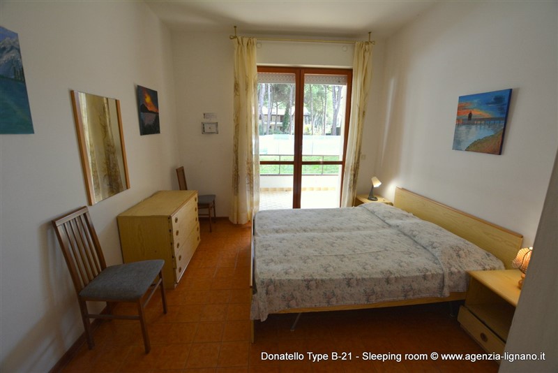 Hezký aparmánový komplex ležící přibližně 200 metrů od pláže, obklopený zelení a jen pár kroků od centra Lignano Riviera, kde naleznete celou řadu obchodů, barů, pizzerií a restaurací. Nedaleko se nachází také rozlehlý Riviera Park s 20.000 m² zeleně.Každý apartmán je vybaven satelitním televizorem, KLIMATIZACí, WI-FI zdarma u bazenu. Bazén JE OTEVŘEN OD KONCE KVĚTNA DO PŮLKY ZÁŘÍ. Součástí komplexu je společná zahrada a výtahy.Typ B-21: přízemí: prostorný obývací pokoj-jídelna s rozkládacím gaučem a velkou terasou s výhledem na bazén se stolem, židlemi a lehátky, kuchyňský kout s lednicí s mrazákem, 1 ložnice s manželskou postelí, koupelna s oknem, sprchou/WC a pračkou, jedno kryté parkovací místo a trezor zdarma. Videoclip