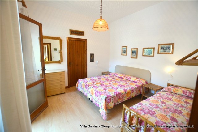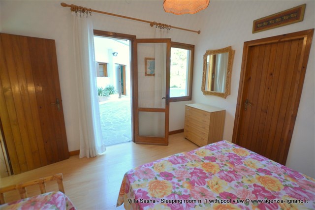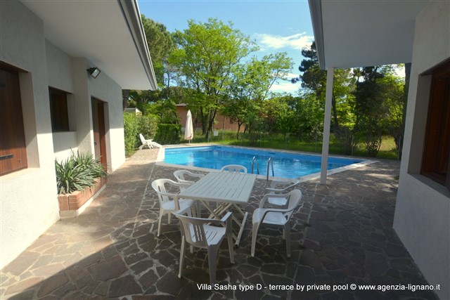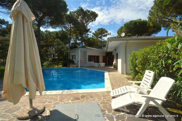 Prestižní vila pro tři rodiny, která se nachází v nejtišší části Lignano Riviera, jen pár kroků od centra a pláže, ponořená do zelené oázy, je ideální pro klidnou a relaxační dovolenou, kde si děti mohou hrát v bezpečí. V byte najdete WI-FI ZDARMA u bazenu.Typ D: velký obývací pokoj se 2 jednolůžkovými rozkládacími lůžky a satelitní TV, kuchyň s lednicí a mrazákem, mikrovlnná trouba a malá terasa s umyvadlem, podkroví s druhou Tv sat, třílůžkový pokoj, dvě ložnice se dvěma lůžky nebo manželskou postelí, dvě koupelny s vanou, terasa s výhledem na soukromý bazén, garáž s 1 parkovacím místem, oplocená zahrada se dvěma parkovacími místy a krbem. Součástí jednotky je pračka, myčka, klimatizace, bazén, k dispozici je venkovni stul židle, a lehátka.