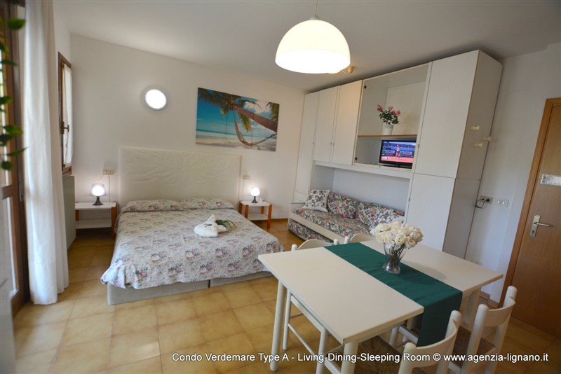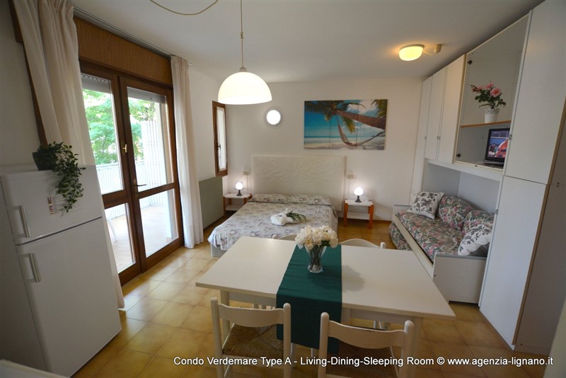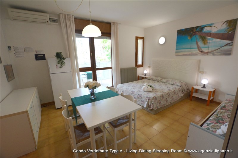 Elégant résidence à quelques pas de la plage et du centre de Lignano Riviera. Dans les environs immédiats sont les principaux magasins d'alimentation, des snacks, pizzerias et des magasins. Non loin se trouve le Riviera Parc, 20.000 mètres carrés de verdure, snack bar, animation et parcours aventure suspendue entre les arbres. Chaque appartement dispose d'un WI-FI GRATUIT, SAFE gratuit, la télévision par satellite et d'un parking numérotée. Le bâtiment dispose d'un jardin, ascenseur et machine a laver commune. Garages disponible à payer. Pour le louer dans l'hors saison, chaque appartement disposée de chauffage à payer. Type A: studio avec 1 lit double et 1 canapé-lit double, kitchenette avec micro-ondes, salle de bains avec douche, grande terrasse avec table et chaises. Climatisation. Videoclip