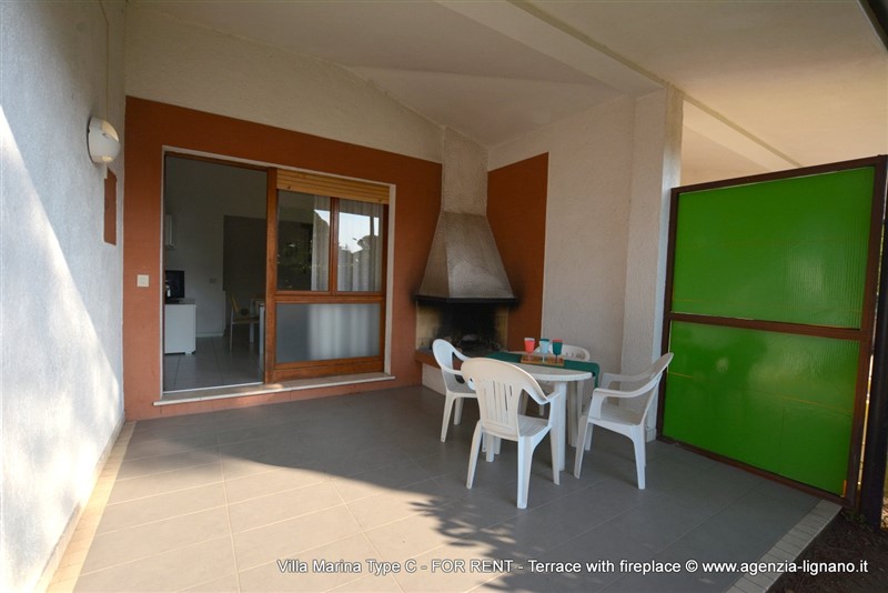Type C: salle à manger avec canapé-lit double, coin cuisine avec micro-ondes, 1 chambre double, 1 chambre à deux lits, salle de bains avec douche. Patio avec une cheminée, table, chaises et 2 chaises longes.