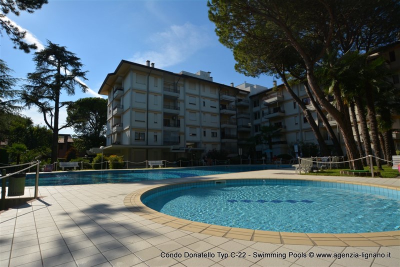 Elégant édifice avec piscine communautaire ouvert de la mi-mai dans la moitié en Septembre, situé au 200 mètres ca. de la plage, entouré de verdure et à proximité du centre de Lignano Riviera, où il ya des magasins comme les supermarchés, snack-bars et pizzerias. A proximité se trouve le Riviera Park -20.000 mètres carrés de vert. Grand jardin communautaire et ascenseurs. Chaque unité possède une TV / SAT, WI-FI gratuit près de la piscine, climatisation. Type C-22: salon - salle à manger avec canapé-lit double et terrasse meublée avec table et chaises donnant sur l'espace vert appartenant à l'État, kitchenette avec réfrigérateur avec compartiment congélateur, 1 chambre double, 1 chambre avec canapé-lit double, salle de bain avec fenêtre et douche. Un Safe pour une utilisation gratuite. Videoclip