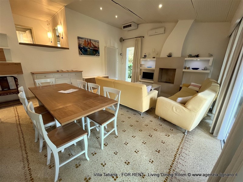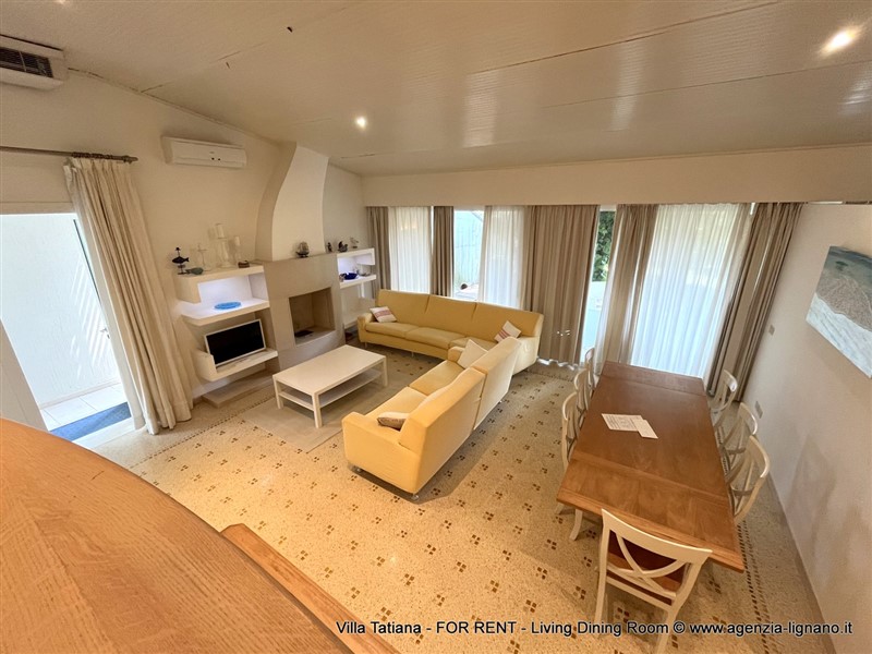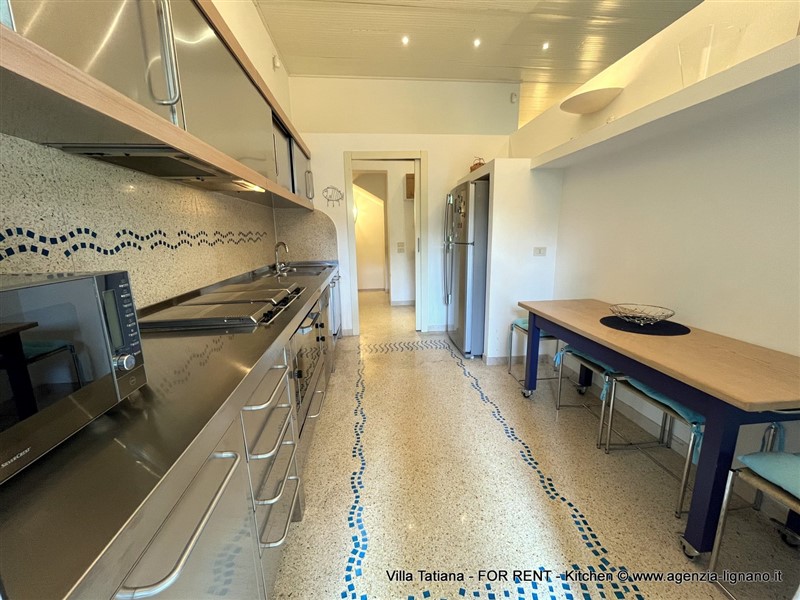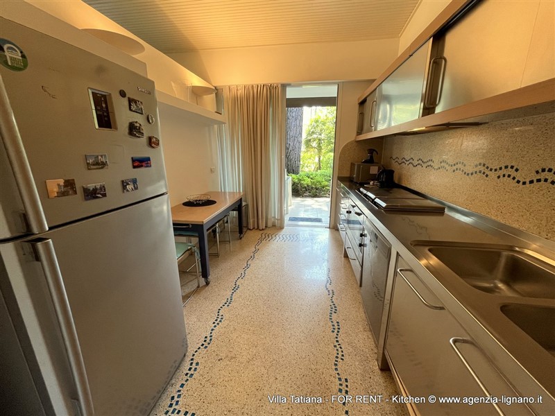 Rez-de-chaussée : grand salon-salle à manger avec accès direct à la splendide terrasse, cuisine séparée équipée de réfrigérateur avec compartiment congélateur, lave-vaisselle et four micro-ondes.