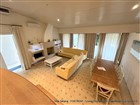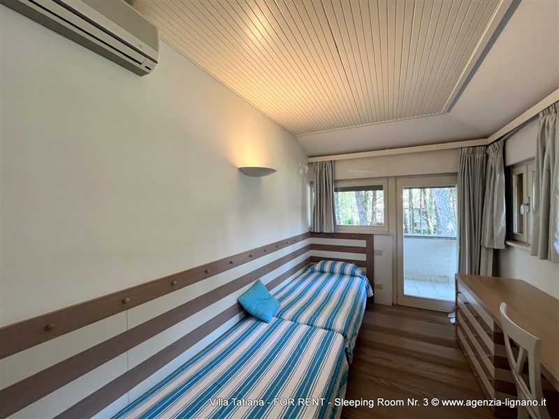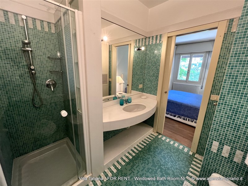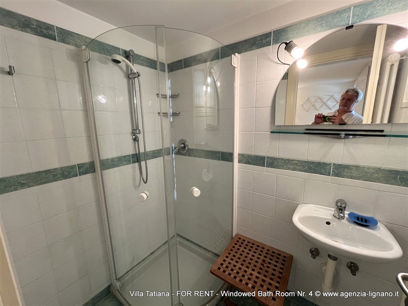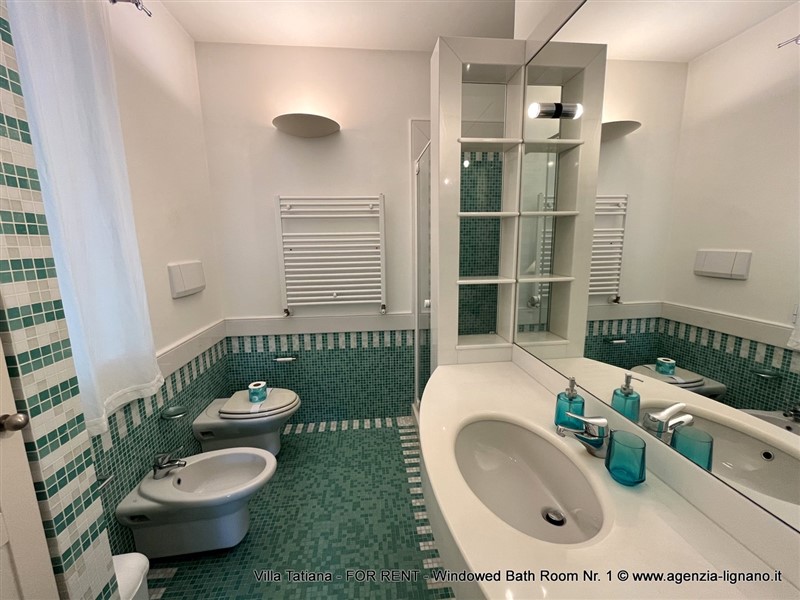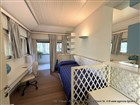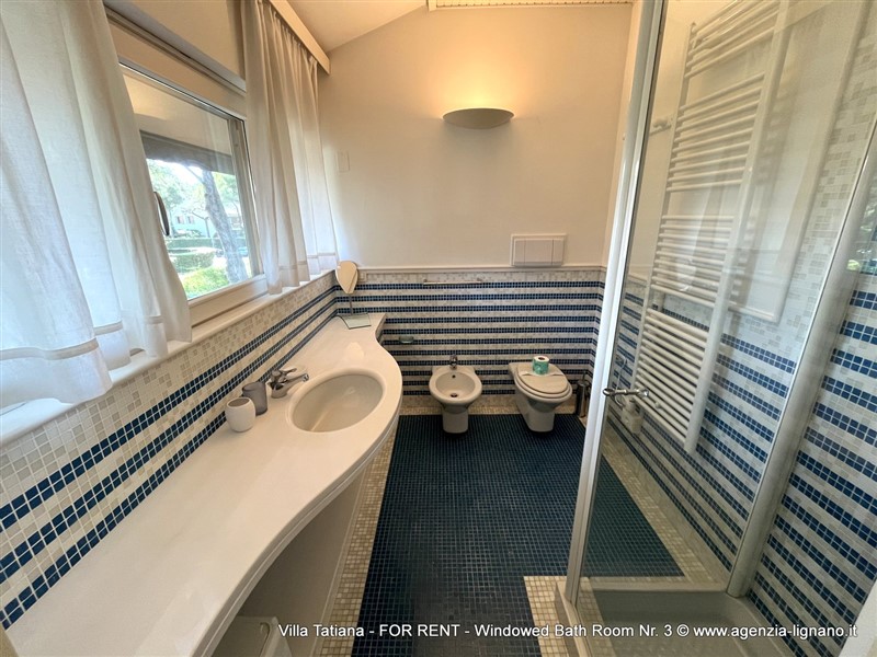 Etage mezzanine : une chambre double avec salle de bain privée avec fenêtre, complète avec douche, lavabo, bidet et WC ; une chambre avec deux lits simples; une salle de bain vitrée avec douche, lavabo, bidet et WC.